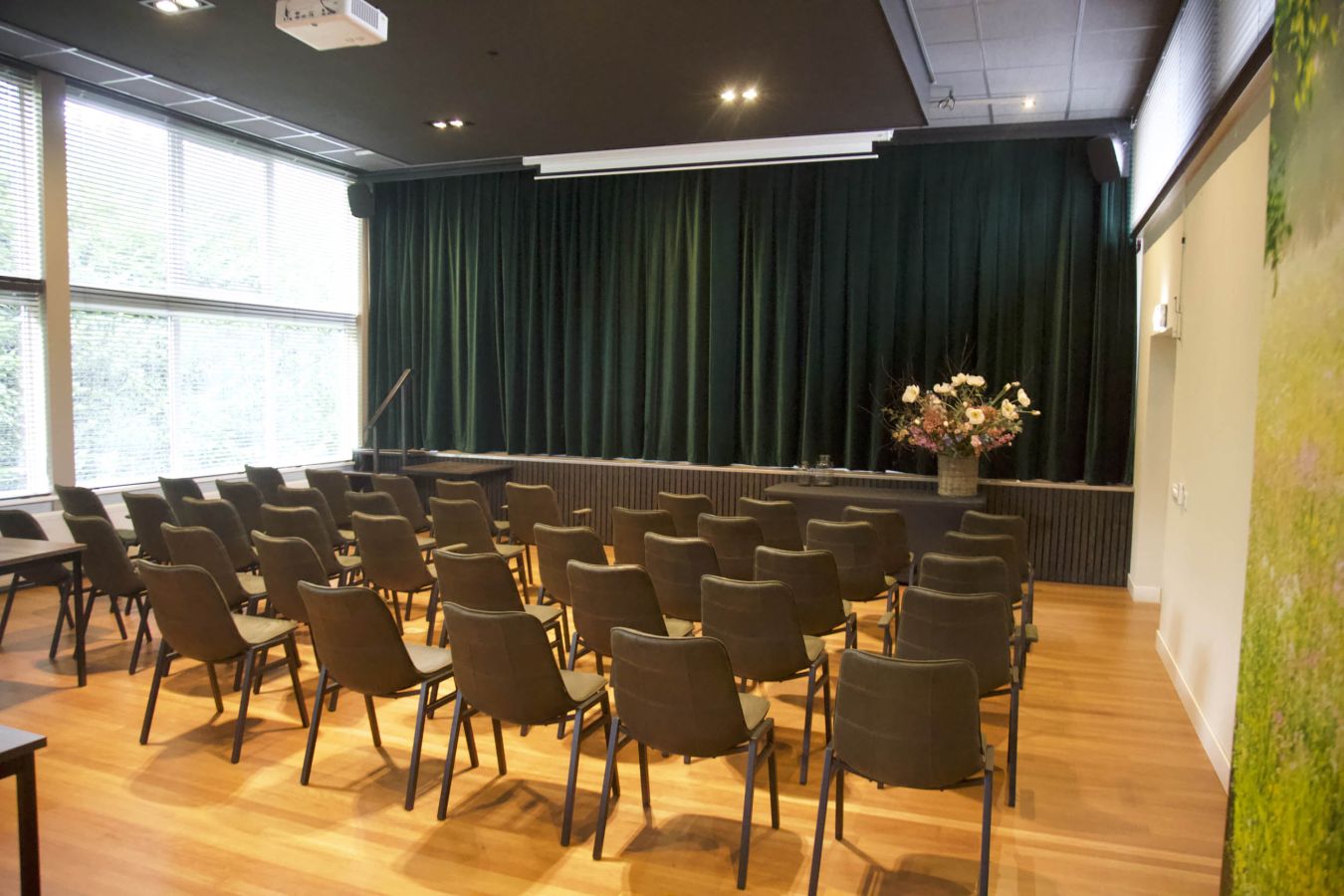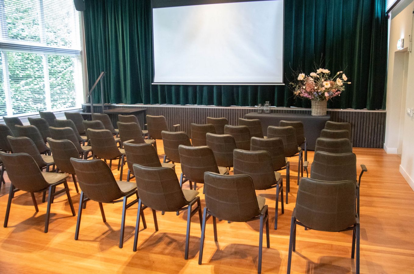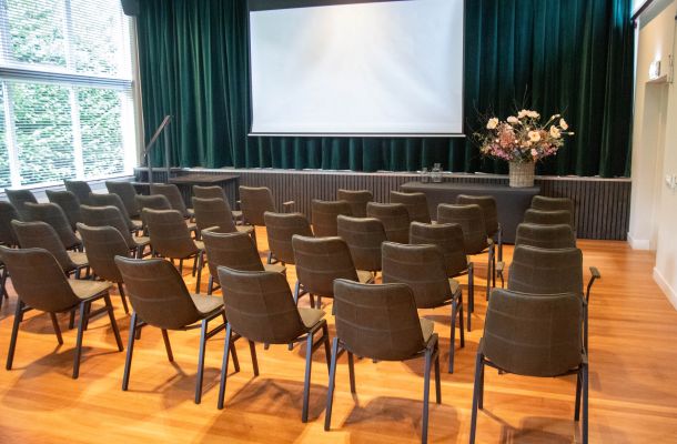 Door zaal 1 + 2 te combineren ontstaat een grote zaal; de aanwezige paneelwand wordt in dit geval naar twee zijden weggeschoven.